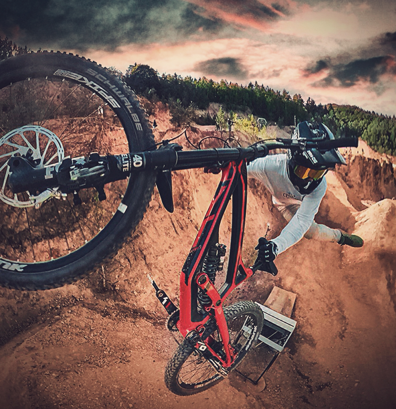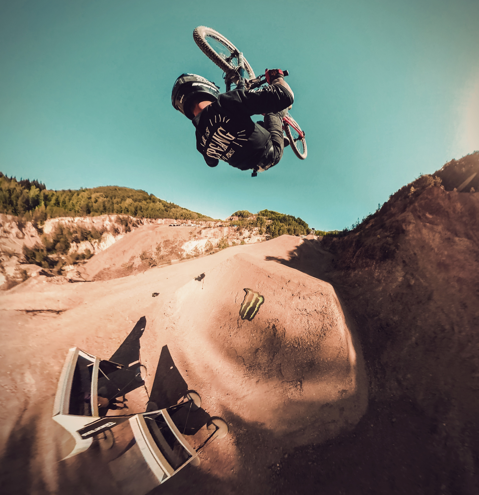 This picture was taken with a gopro fusion. I am doing a frontflip with the dh bike at the slopestyle line with a long mount that was on my back.