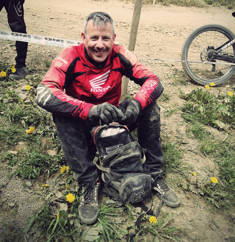 I took off from a jump at the start of the Freeride trail and got bucked off the lip. This threw me forward and way up into the air. As I landed the front wheel dug into a braking bump hole and threw me over the bars, onto my back and head sideways.